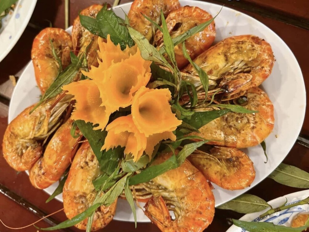 Tôm sống sơ chế cùng với sốt thái công thức Làng Chài vẫn giữ được độ ngọt tự nhiên của tôm. Được bài trí trên chiếc ghe mini giúp món ăn thêm lạ mắt.