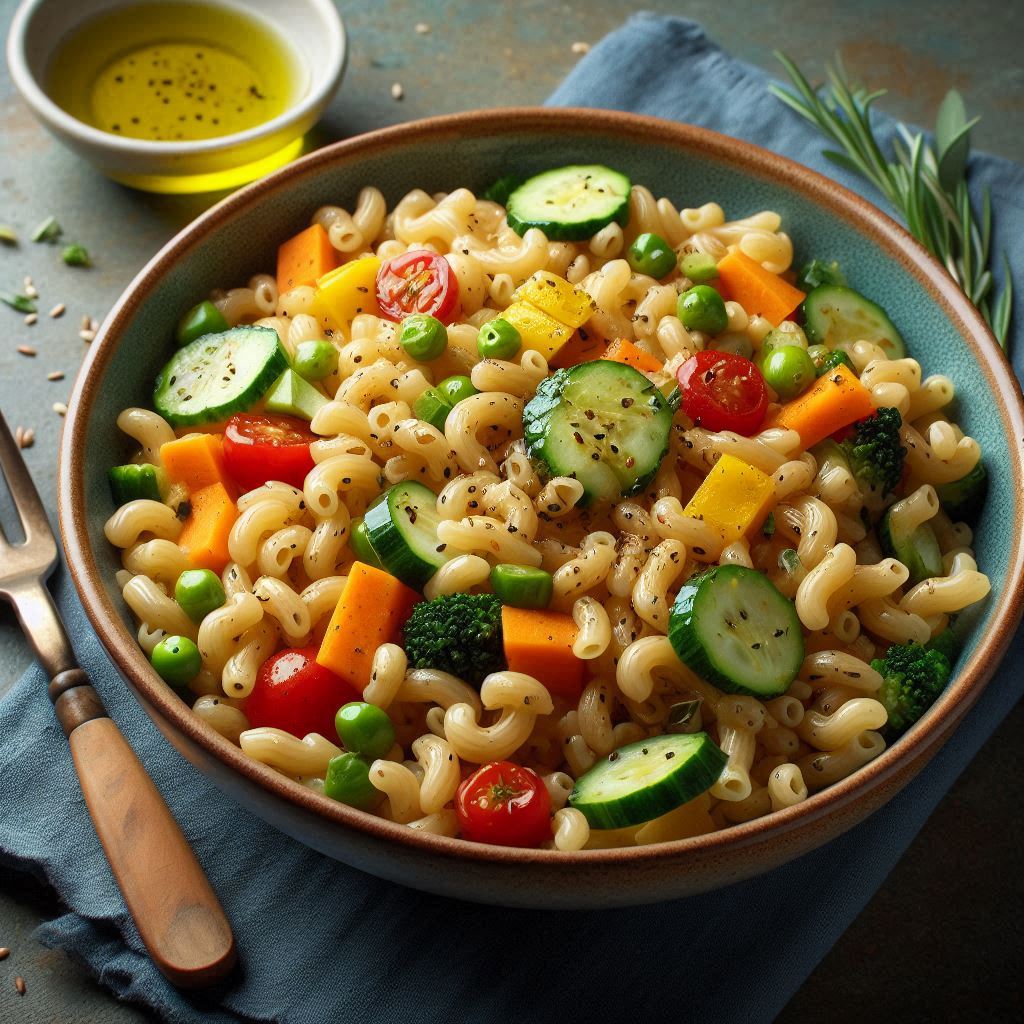 - Cho nui gạo lứt và rau củ ra đĩa, rắc một ít tiêu xay lên