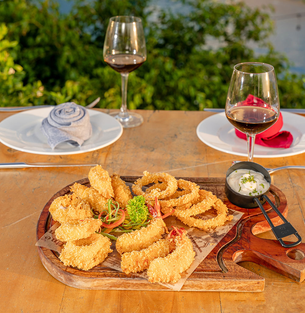 Tầng 2 là không gian ngoài trời được bao quanh bởi thiên nhiên, mây trời Phú Quốc với tầm nhìn ra vịnh biển và núi rừng, chuyên phục vụ các món ăn được làm từ chính hải sản đảo ngọc.