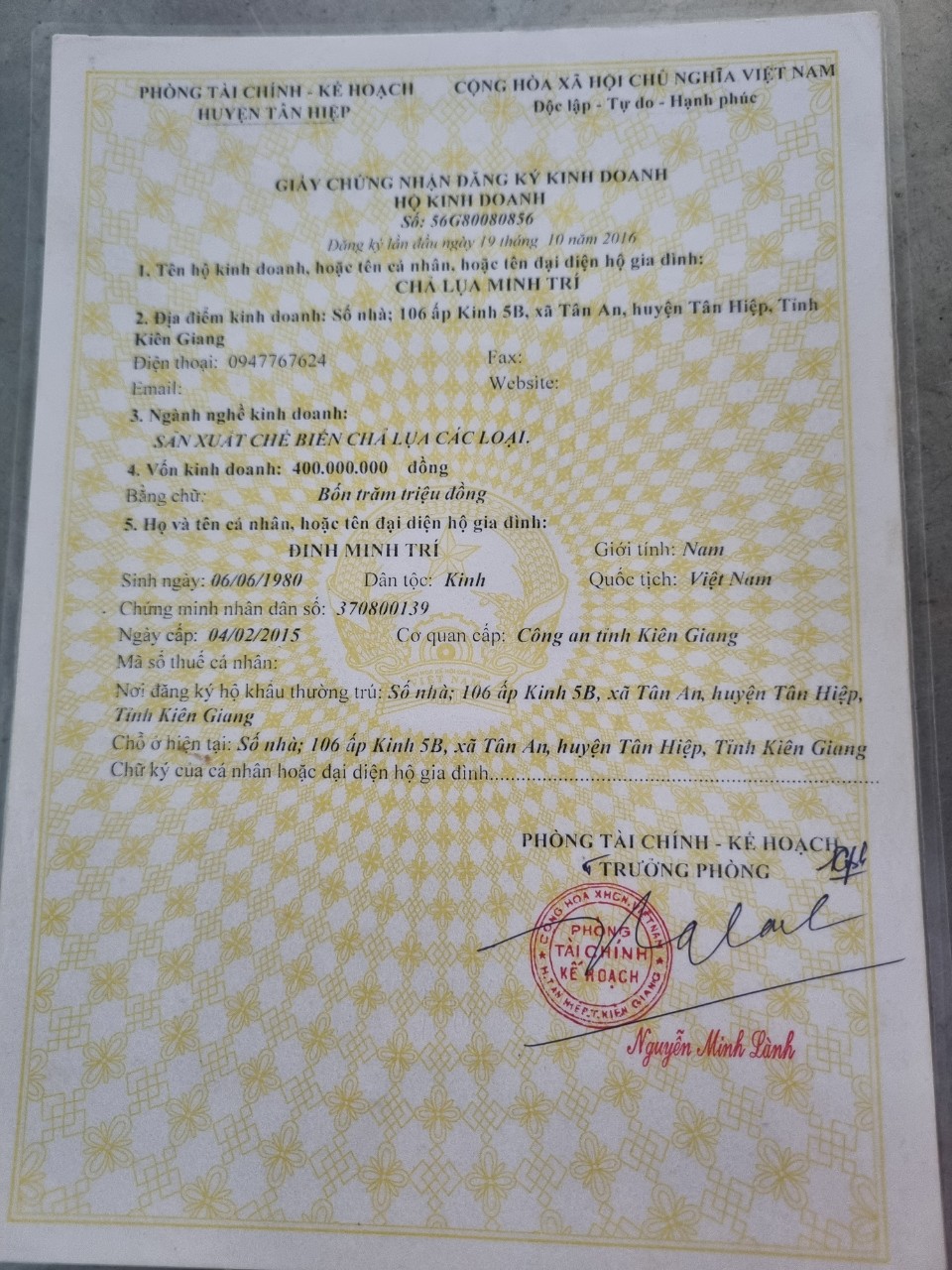 Ngày 19 tháng 10 năm 2016, Cơ sở sản xuất Chả lụa Minh Trí ở xã Tân An, huyện Tân Hiệp được thành lập để từng bước xây dựng và phát triển thương hiệu Chả lụa Minh Trí.