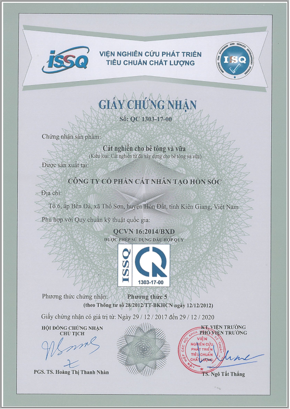Công ty đã đi vào hoạt động từ tháng 7 năm 2017, sản phẩm gồm có: Cát trộn bê tông và cát vữa xây tô có kích cỡ tương đương với cát tự nhiên trên thị trường. Sản phẩm được quản lý chất lượng theo tiêu chuẩn ISO 9001: 2015; phù hợp với Quy chuẩn quốc gia (QCVN 16:2014/BXD); được Sở xây dựng Kiên Giang công bố hợp quy.