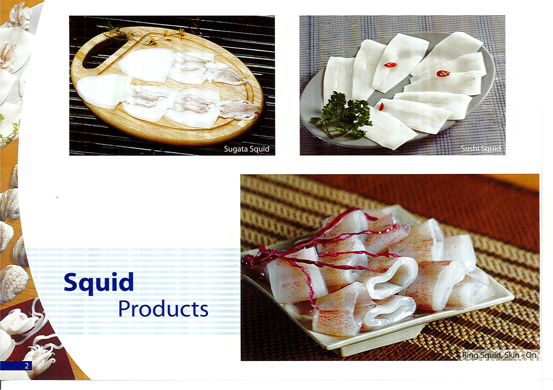 - Mực nang, Mực lá, Mực ống như: Nguyên con, nguyên con làm sạch, fillet, sushi, somen, tube, cắt khoanh, sugata,…