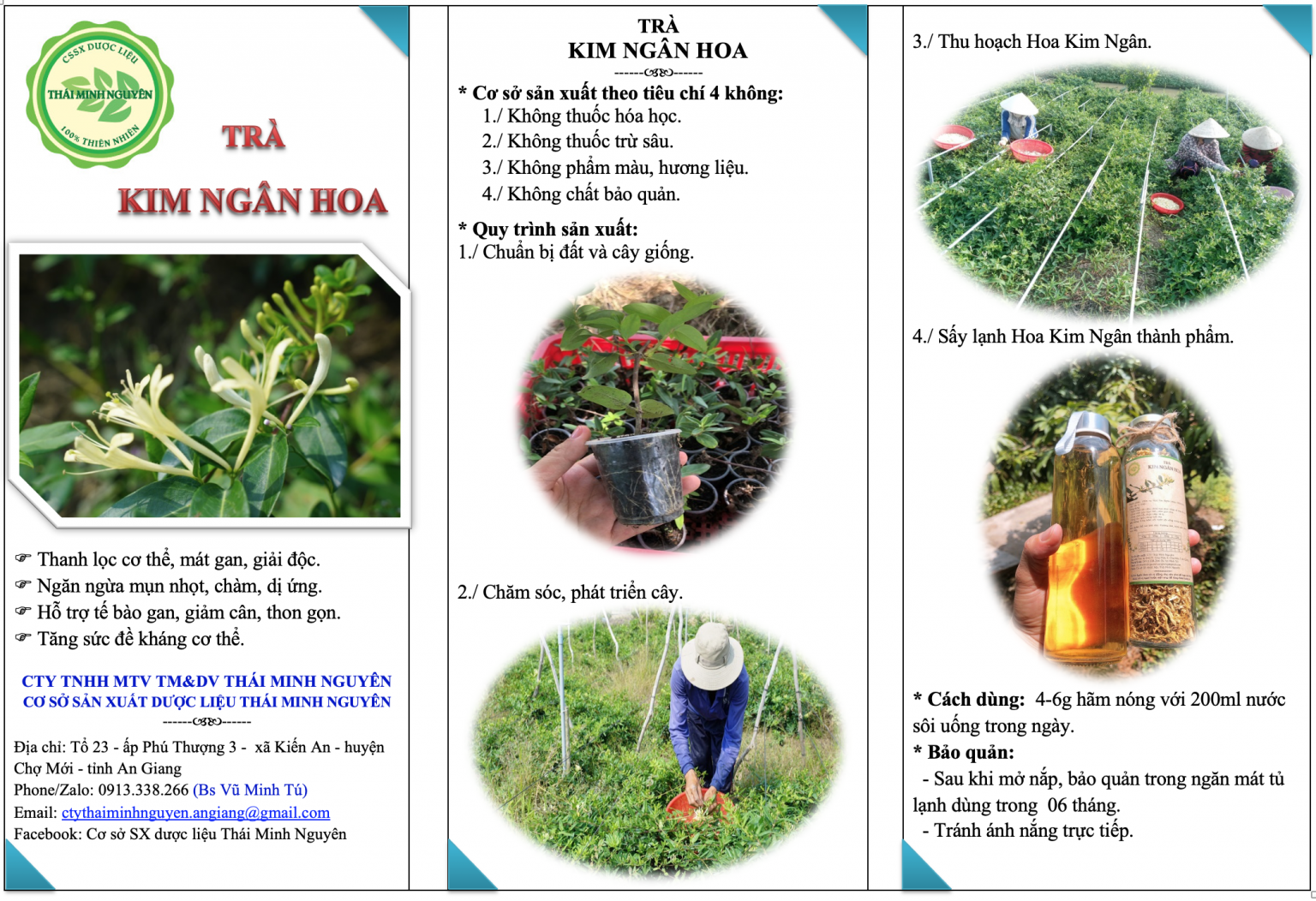 Bên cạnh việc hình thành vùng nguyên liệu an toàn, Công ty THÁI MINH NGUYÊN được thành lập để xây dựng thương hiệu trà kim ngân hoa. THÁI MINH NGUYÊN cam kết với tiêu chí “4 không” (không phân bón hóa học, không thuốc trừ sâu, không chất bảo quản, không hương thơm và chất tạo màu nhân tạo).