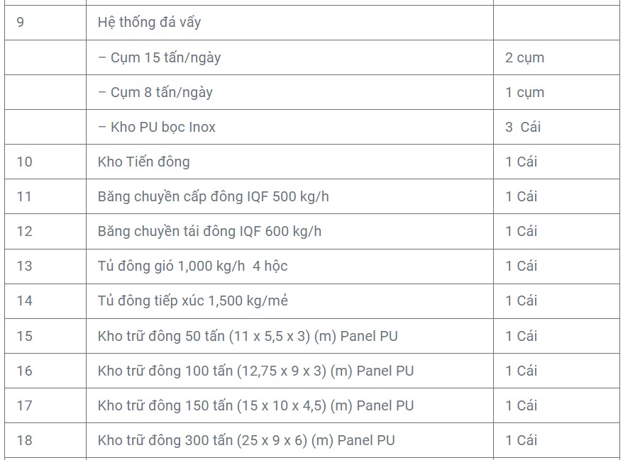 - Nhà máy sản xuất Thủy sản đông lạnh: 1,800 tấn/năm