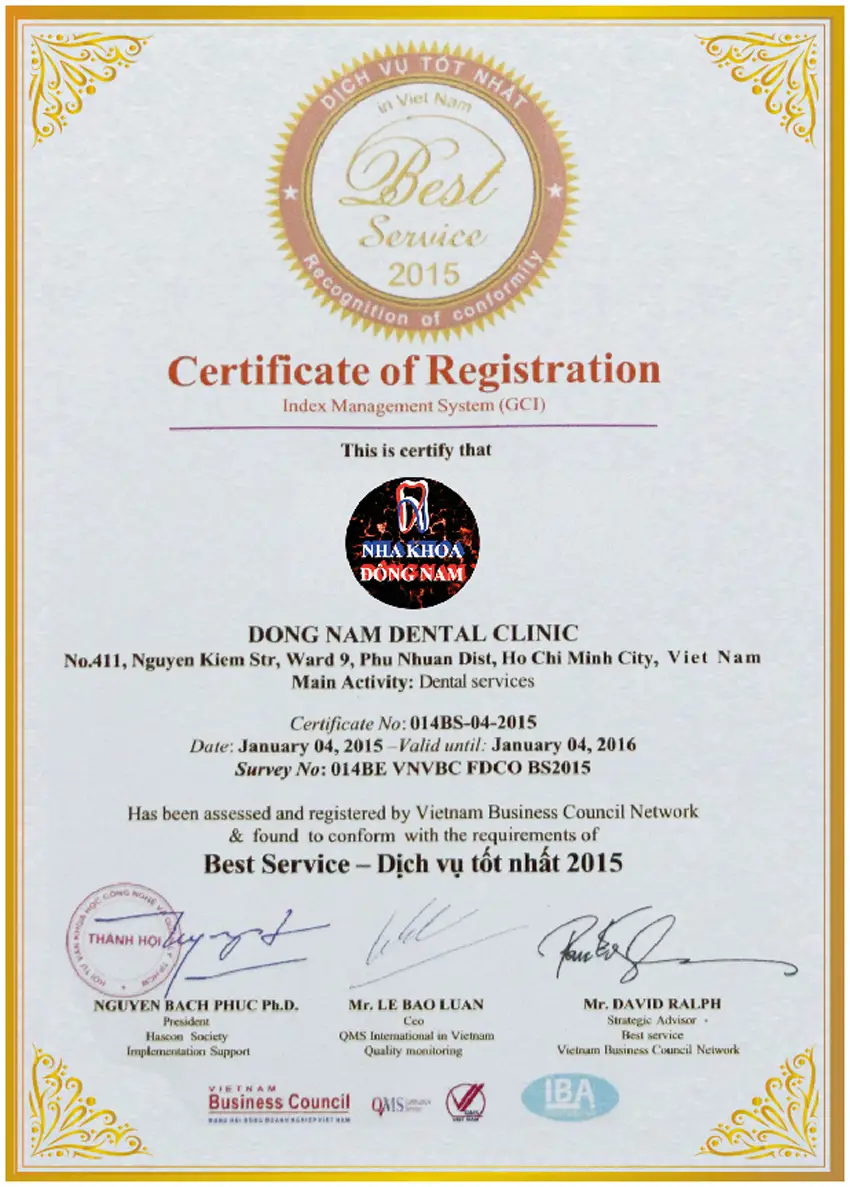 Hệ thống phòng khám Nha khoa đạt tiêu chuẩn của Bộ Y tế với giấy phép hoạt động số 03708/SYT-GPHĐ và 01672/HCM-GPHĐ.